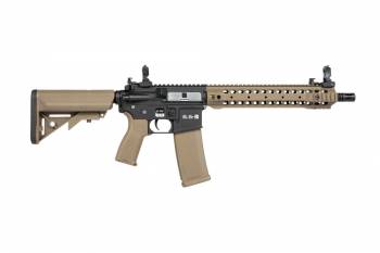 SA-E06 carbine replica is equipped with a free-float handguard in RIS 22 mm system. Apart from a long, top RIS rail that features flip-up iron sights, the replica also has a short rail under the barrel and on the sides.