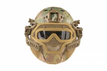 FAST Gunner Helmet Replica are a new quality standard in terms of head protection. Both the comfort of wearing and versatility are the definite markers of this series. The webbing is based on foam pads whose position can be rearranged in order to adapt the helmet to the shape of the wearers head. The helmet features a 4-point suspension system which gives a rapid and easy way of adjustment. The adjustment range for the circumference of the head is increased via a knob at the rear of the helmet. Webbing’s elements and suspension are supports that are covered with material absorbing perspiration. On the outside of the helmet there is a night vision mount, on either side of the helmet there is a universal RIS 22 mm mounting rail that enables the attachment of any accessories of choice such as tactical lighting. A significant part of the shell’s surface on the side and in the rear is occupied by a hook and loop fastener, which can be used for the attachment of straps, identification elements or visible light / IR markers. The helmet itself is modular in that the lower part of the mask can be easily removed by pressing the lock buttons on both sides of the helmet. The mask then slides off of the mounting rails. The shield features a high quality made from durable, elastic polymer. With and implementation of steel mesh covered in anti-corrosive laminate allowing for airflow and the distance of the lens from the face fogging is reduced. ATTENTION! Product does not constitute ballistic eye protection and its usage with such intention is invalid with its original purpose! The manufacturer or the vendor do not bear any responsibility for any possible bodily harm or material damage that might result from using the product as eye protection during games with the use of Airsoft guns and the product cannot be advertised for such purposes.