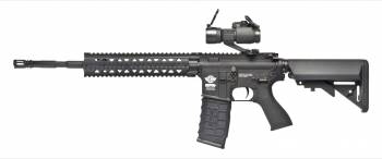The G&G CM16 R8-L is a great starter package for anyone looking to get into the sport of Airsoft. With a design based of the M4A1 platform and customised accessories on the externals, this gun is a fantastic option for those wanting a platform to build on in the future. An amazing feature of this rifle is the fact it comes with a tactical red dot in the box, meaning you can save money purchasing one separate. The gun is built from mostly polymer and aluminium parts with polymer receiver, pistol grip, 6 position stock, hand guard and magazine; as well as aluminium outer barrel, inner barrel, gearbox, stock tube, sling loop and trigger.