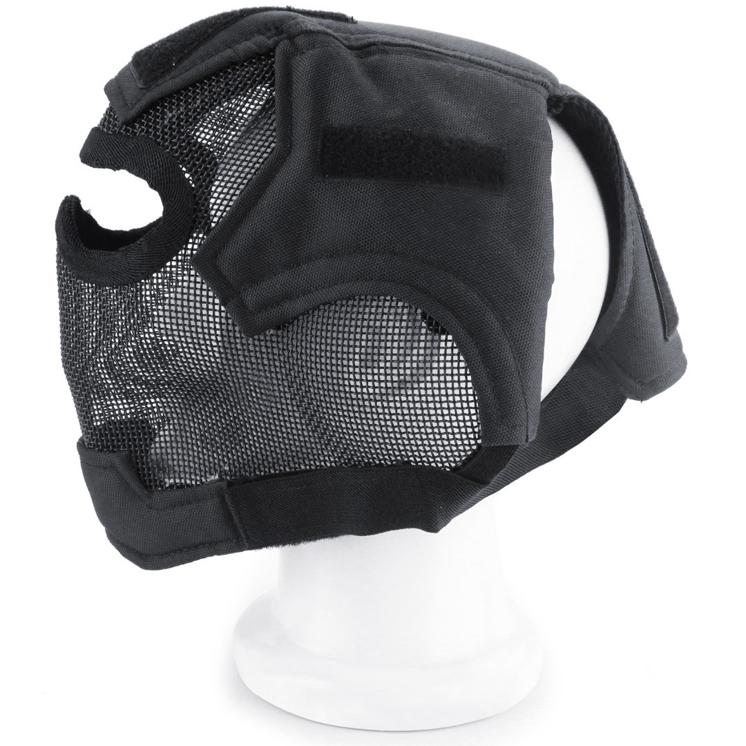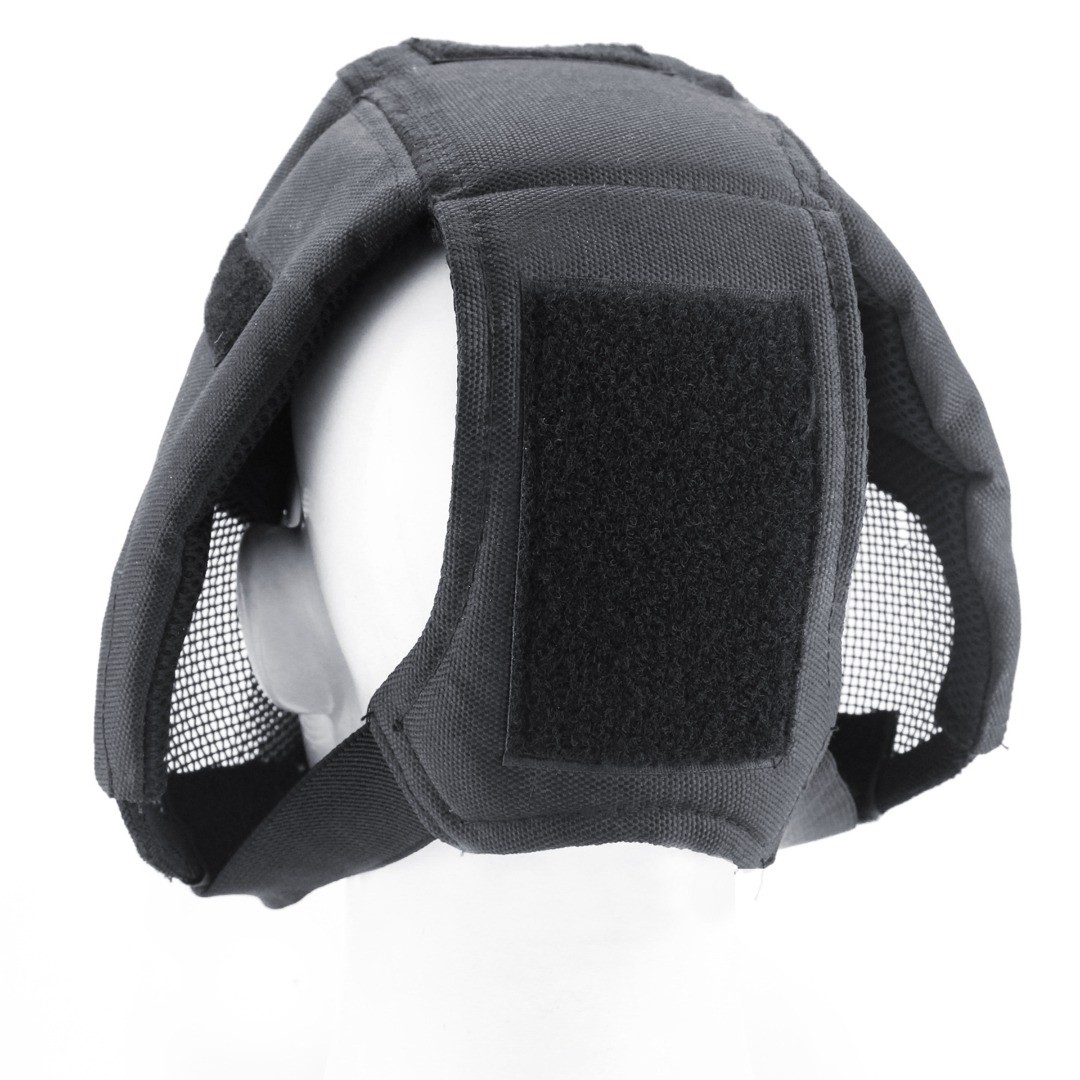 Full-coverage steel mesh head cage mask with flexible eye protection options, durable fabric panels, and secure elastic retention.