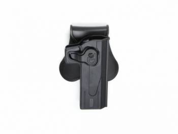 With the large release/lock lever, the weapon sits firm and secured inside the holster for all demanding situations. The holster comes standard with a paddle mount for belts up to 42 mm width or pant waists allowing for concealed carry. The paddle features a rubberized back for comfort and better grip.