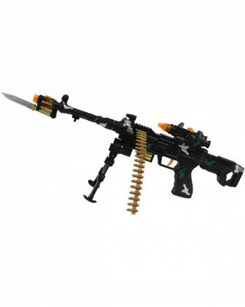 • Automatic bullet feed • Built in fold down bipod • Vibrates • Flashing lights • Total gun length: 59cm • Requires 3 x AA batteries (not included) • Suitable for ages 3+ • May require adult supervision • Warning: Choking hazard - contains small parts