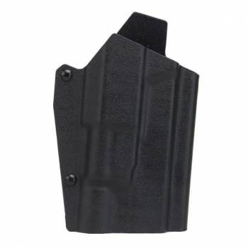 The main material of this holster is the semi-rigid “KYDEX” – great for retaining your sidearm whilst leaving it easily accessible. Due to its “rigid, flexibility”, the KYDEX will provide a high-friction hold of your sidearm, which is overcome by the force you apply drawing or holstering your sidearm. To get the perfect retention level. there are two “closing screws” that need to be adjusted when the replica is held inside – not too loose, not too tight.