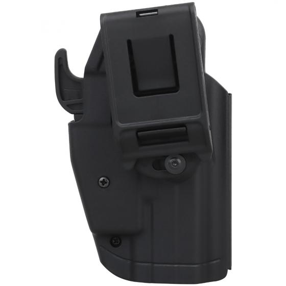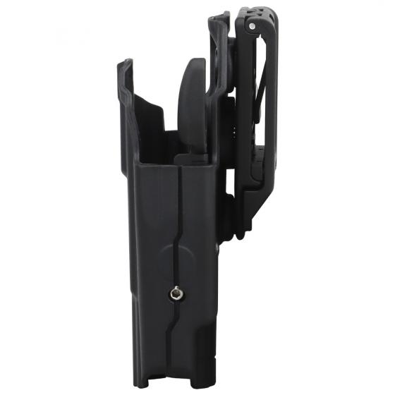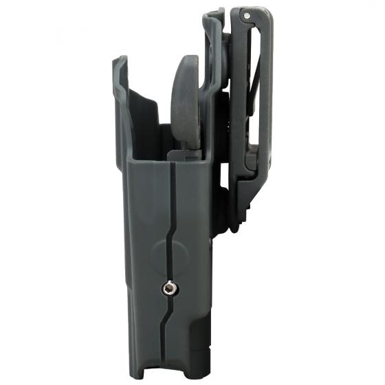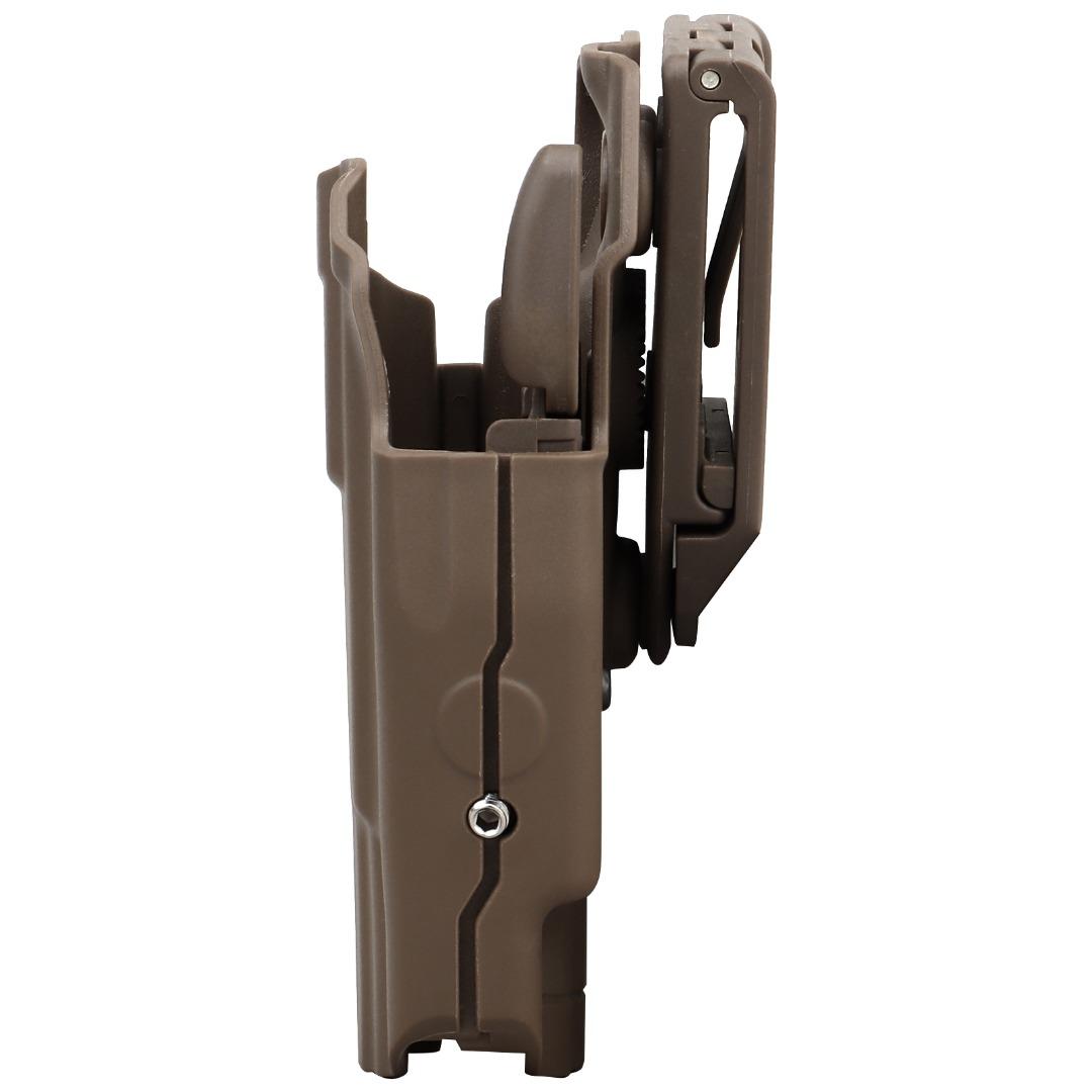 The Holster is fitted to the sidearm by tightening a grub screw along the length of the holster. When inserted, the holster grabs the sidearm via a lug fitted around the trigger guard, this is released via a paddle when drawing. An additional plastic shim-lug is provided to pack out the trigger guard area for a more secure hold if required. Fitted to the user via a 50 mm belt loop.