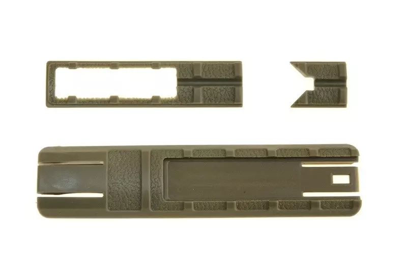 A tan-coloured, well-profiled handguard for R.I.S./R.A.S. rails made of durable ABS. It’s design includes a long ‘pocket’ with shutter, and a cable channel. Overall lenght:: 160 mm.