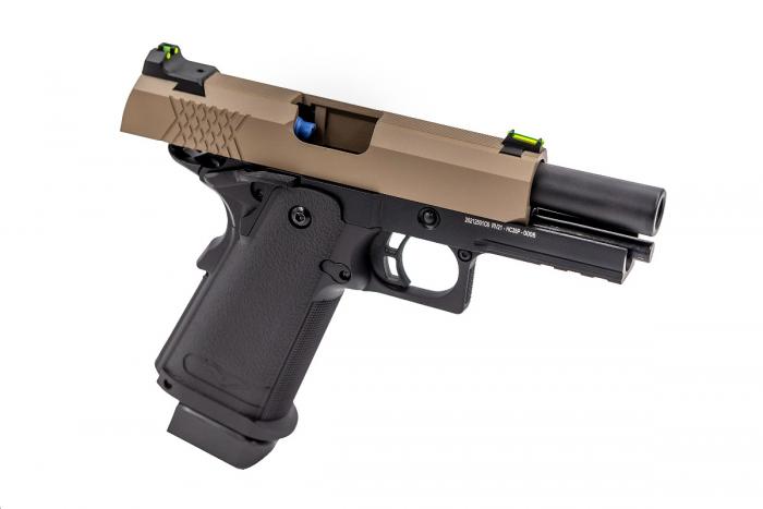 Expect a snappy action and excellent gas efficiency on these shorter barrelled models. The reduced slide travel distance as well as the resulting weight reduction gives the RAVEN Hi-Capa PROs both a fast cycle rate as well as rewarding Blow-Back recoil. The combination of the Hi-Capa’s standard, large gas reservoir with the shortened slide helps this sidearm maintain performance in colder conditions when compared to bulkier sidearms – making the RAVEN Hi-Capa PRO a top-class performer, throughout the seasons.