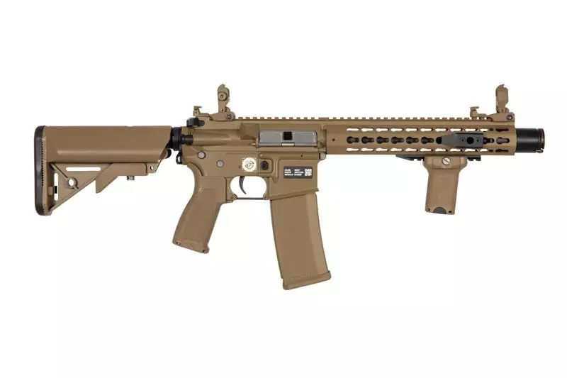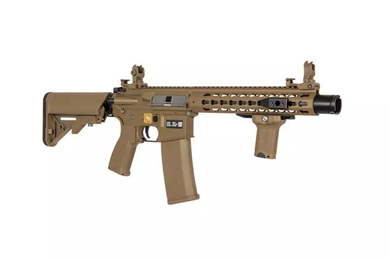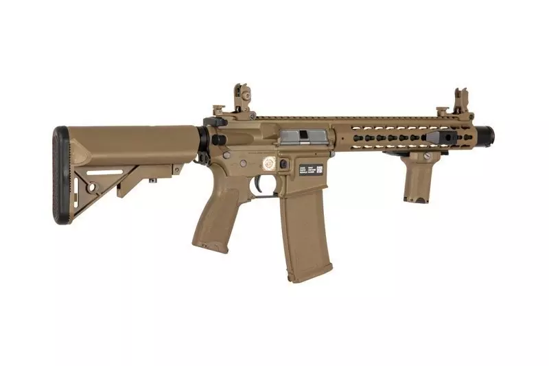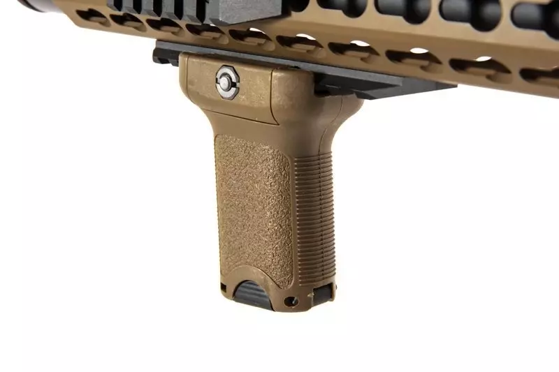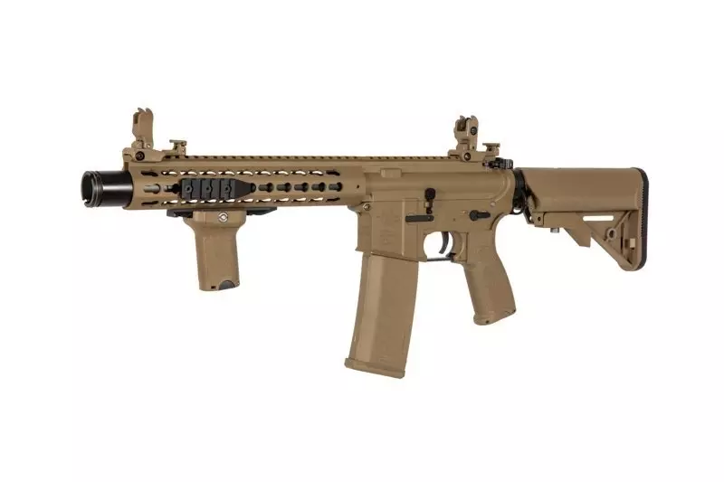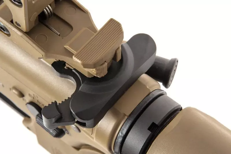 SA-E07 carbine replica is equipped with a Free Float type handguard in KeyMod mounting system that can serve as a mount for various tactical accessories: flashlights, grips, laser sights and optical sights. The barrel features a muzzle device on a 14 mm CCW thread. The top RIS rail features flip-up iron sights.