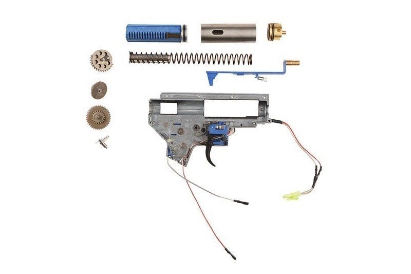 The gearbox which is reinforced on the height of the cylinder’s head hides a steel main spring guide which is the element of the Enter & Convert™ system and also 8mm ball bearings and steel thread-wheels which are placed on spacers. The system is secured with the use of four anti-reversals. There is a type 2 cylinder and the steel breaker and a metal hop-up chamber applied in this replica.