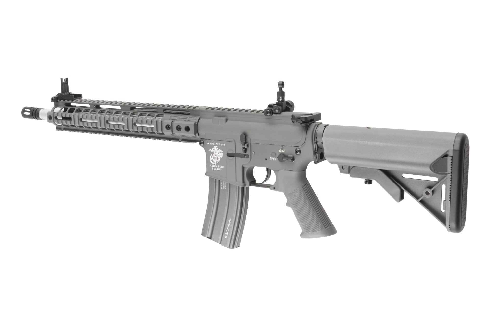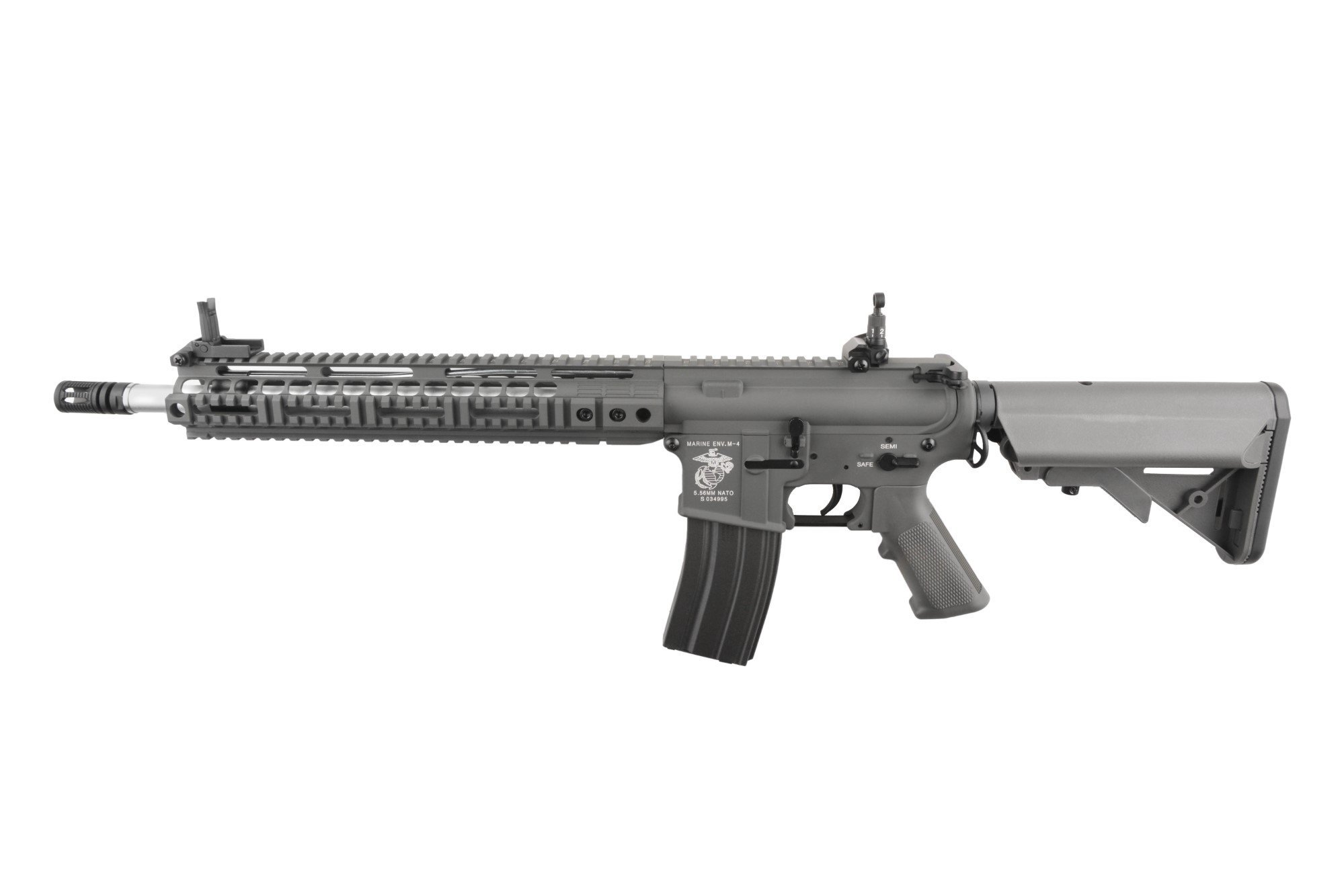 SA-A13 assault rifle replica by Specna Arms is made largely from a uniform zinc and aluminium alloy, reinforced with steel elements in the most vulnerable points of the replica (steel elements – all the screws, pins and tactical sling swivels). Both the SF stock storing the battery and the pistol grip were made from polymer. The receiver of the replica and RIS handguard have undergone the process of anodizing, which guarantees high degree of protection against corrosion. The paint was applied via a process of powder coating, after having the surface undergo the process of sandblasting prior to the application of paint. This provides a much higher than usual resistance of the applied paint to abrasion. The receiver bears USMC markings.