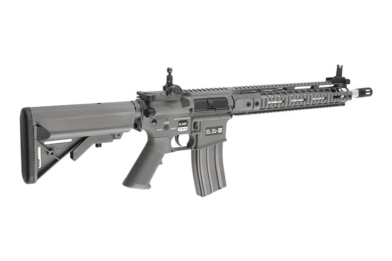 The replica is equipped with a 22 mm top RIS rail, RIS handguard and an adjustable stock. The top RIS rail features metal flip-up iron sights, which can be freely detached in order to make room for the attachment of a chosen optoelectronic aiming device. Due to the extendable stock with an anti-slip stock pad it is possible to adapt the replica’s length to the body type and preferences of the user. Standard flash hider is based on 14 mm left-handed thread, which allows the attachment of a silencer in its place.