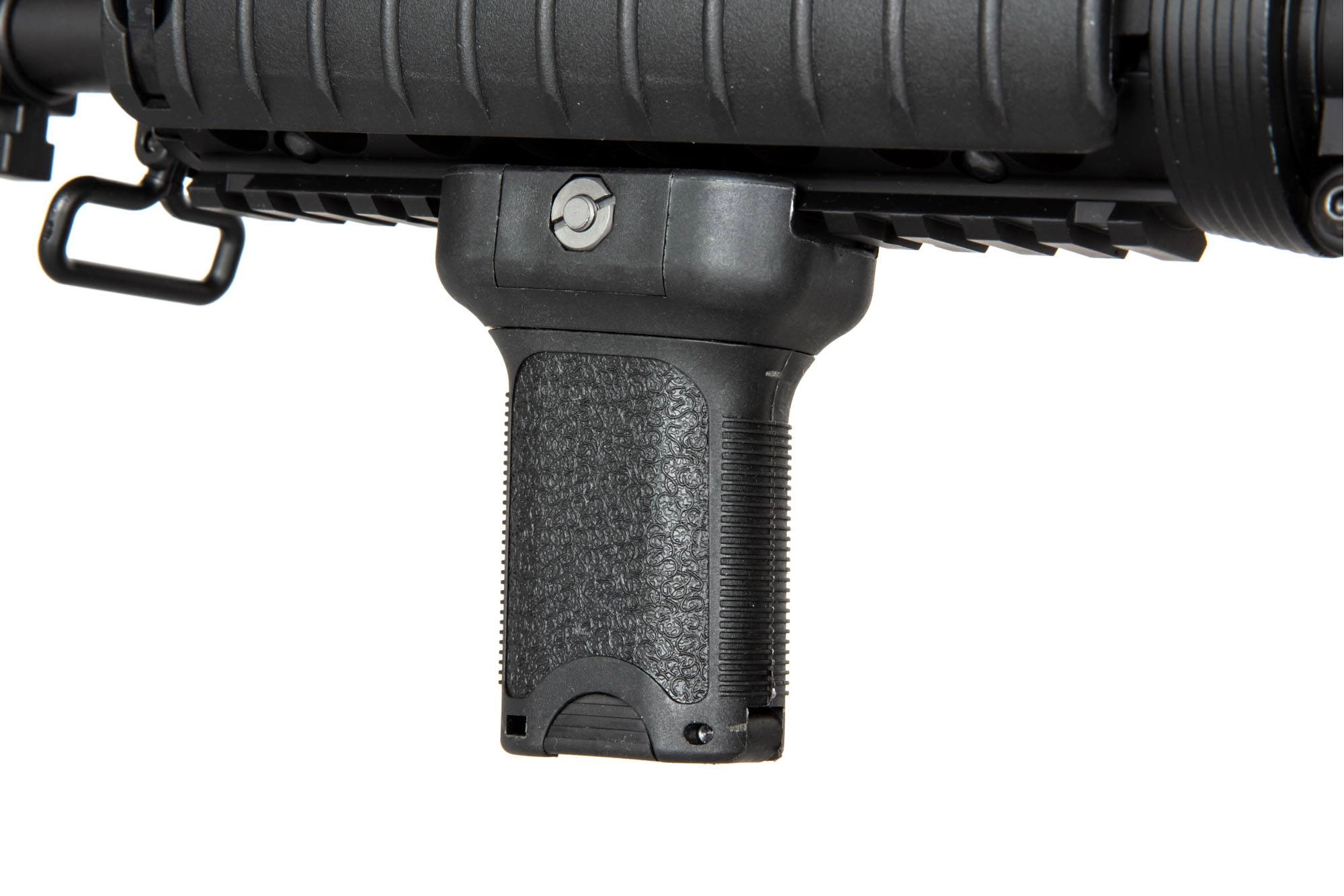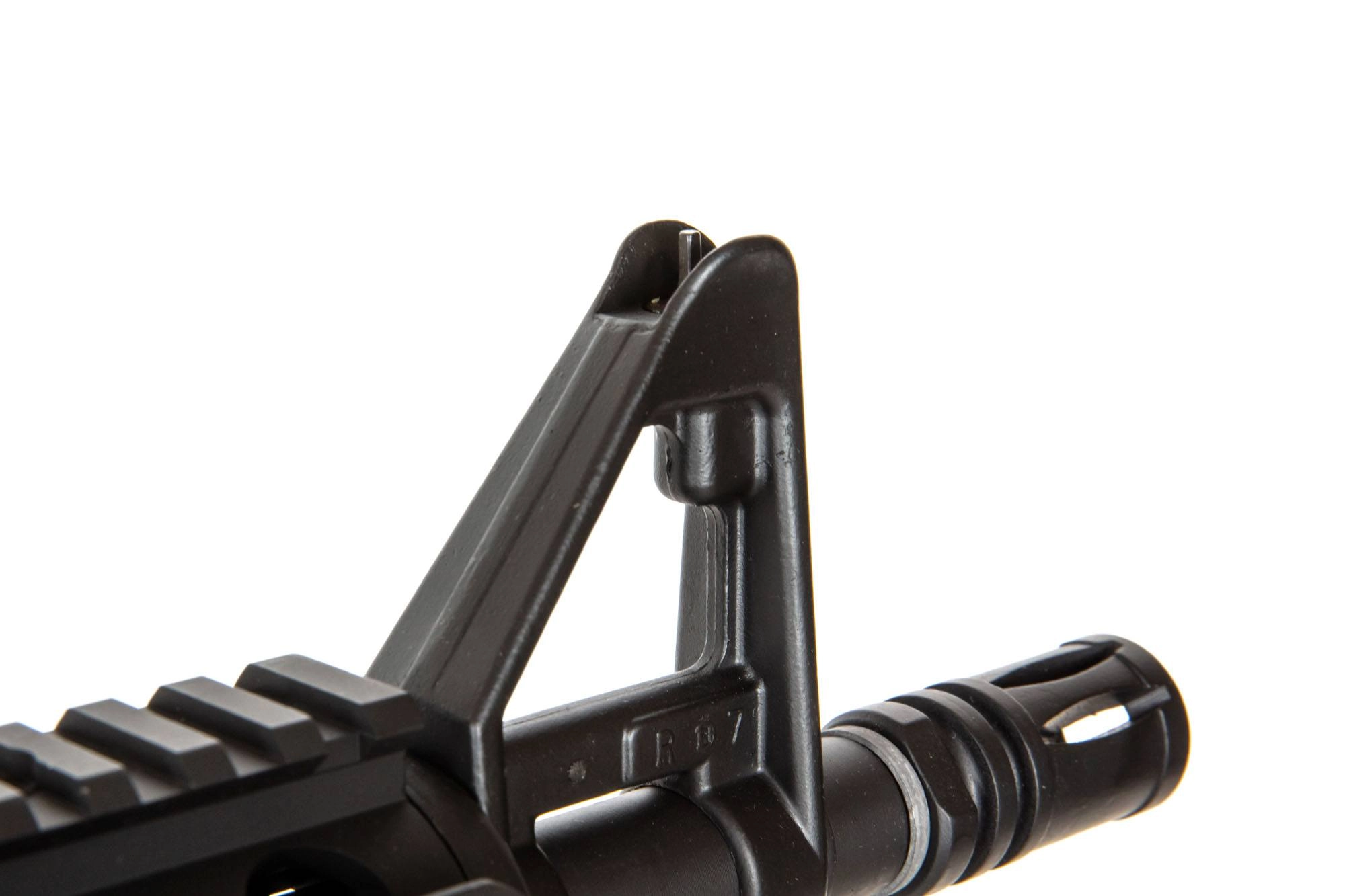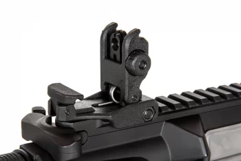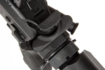 The SA-E04 assault rifle replica is equipped with a classic short 22mm RIS front that allows for the installation of various accessories – grips, flashlights, laser pointers and optical sights. The barrel of the replica is ended with a muzzle device mounted on a 14mm CCW thread. Foldable mechanical sights were placed on the top RIS rail.