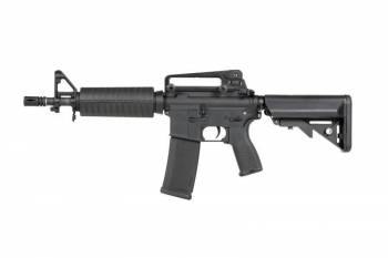 SA-E02 carbine replica is equipped with a classic, short, polymer handguard. The barrel features a muzzle device on a 14 mm CCW thread. The top RIS rail features a transport handle with an aperture sight.