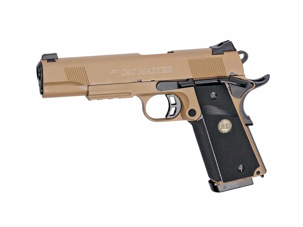 STI TAC MASTER Desert tan. This full metal updated version features many improvements for better handling and performance, like an adjustable competition trigger, comfortable rubber grip and a tactical accessory rail with 3 grooves for mounting lasers or light. This is a fully licensed 6mm Airsoft replica with authentic markings based on the original STI design. Strong internal construction and the use of a CO2 powered magazine, gives you an Airsoft gun with powerful blowback, firing BBs at up to 105 m/s.