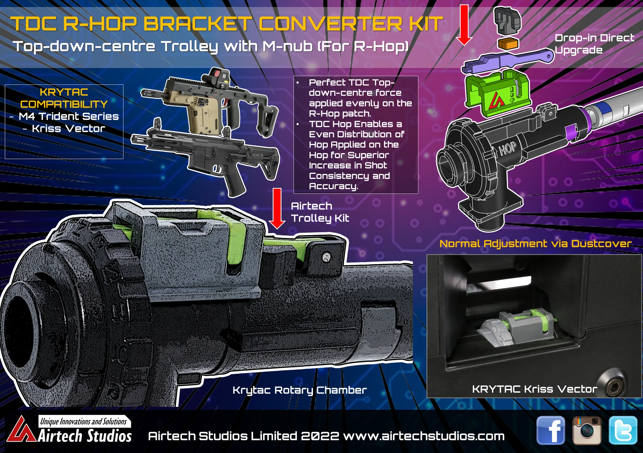 The TDC (Top Down Centre) Trolley Converter is designed for the Krytac Trident M4 and Kriss Vector Series to function perfectly for R-Hop and Flat-hop setups using a trolley system that applies hop perfectly downwards for the most consistent pressure distributed onto the BB. As a result, more accuracy over longer distances.