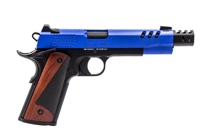 The DEFENDER PRO has an entirely new slide featuring 3 forward vent ports, a top slide ripple pattern and rippled slide grips. The design of the vent ports has been incorporated unto a new “twist and click” moderator that is very easy to remove. Included is a spare barrel bushing if it is the non-moderated look that is required. The pistol grips are a split wood/polymer construction, this leads to a striking design. Finally, a solid trigger is being used for the first time on a VORSK model.
