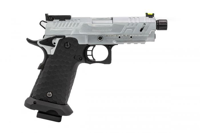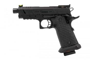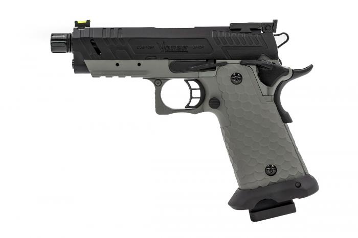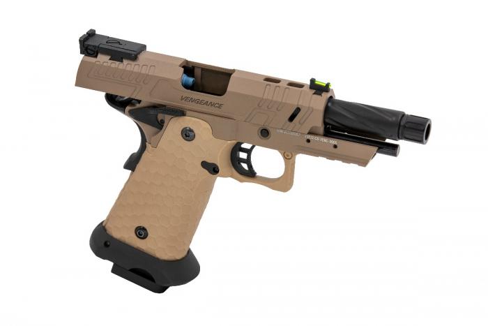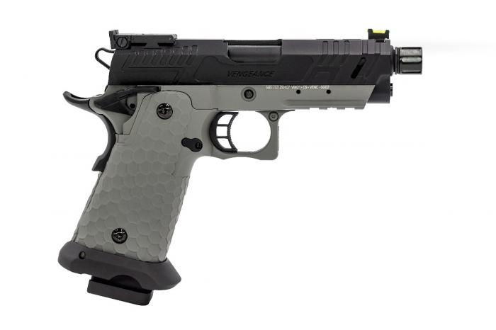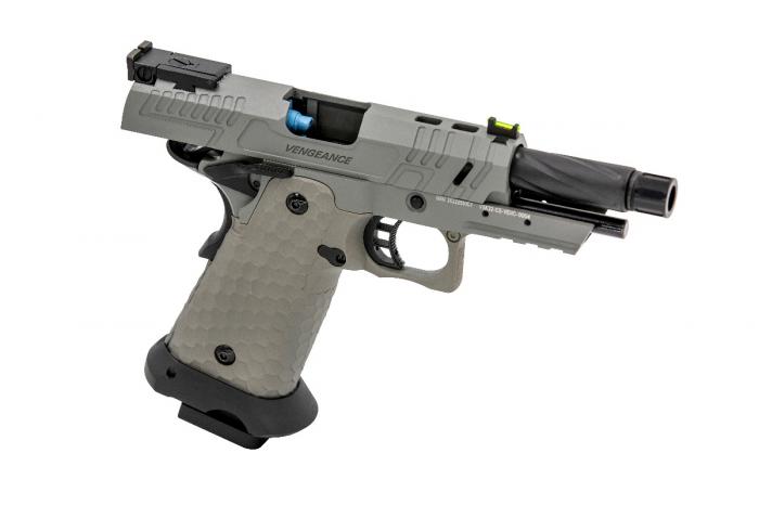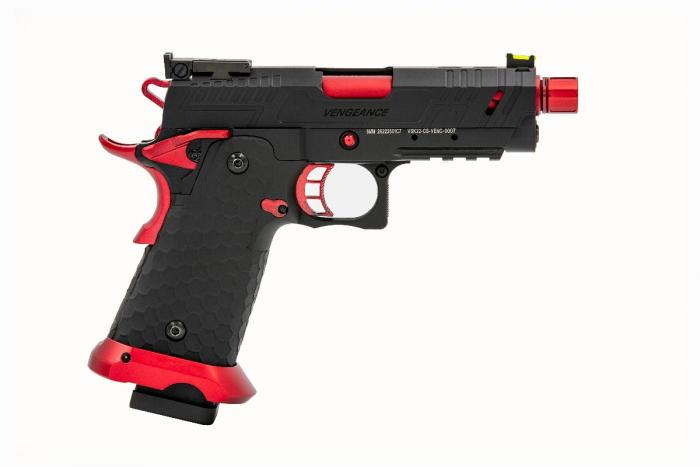The CS VENGEANCE features an adjustable rear iron-sight, an extended magazine base plate and the inclusion of a floating BDS option. The slide markings are a new pattern with some forward cut-outs revealing the fluted outer barrel within. A common feature of our Hi-Capas is the inclusion of a Flash-Hider, that expertly covers a 12 mm (CW) to 14 mm (CCW) thread adaptor, making VORSK Hi-Capas “attachment ready”, especially with the real-estate provided by the Picatinny under barrel.